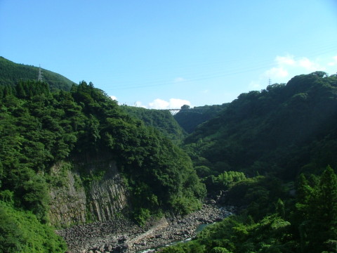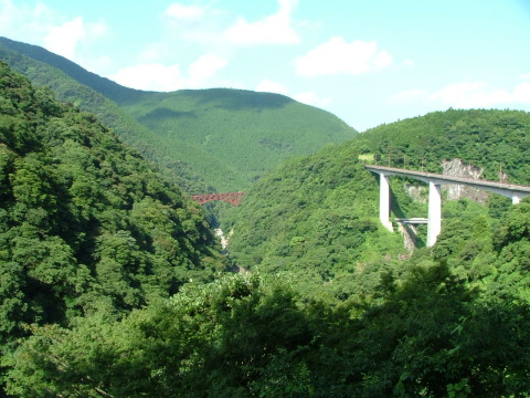 | 第26話 碧翠楼(2008年5月) 阿蘇谷を流れる川を黒川という。南郷谷を流れる川を白川という。 この二つの清き流れはそれぞれの谷の低いところをゆるりと流れ、立野で合わさって白川となり、それからは勢いを増して大津へ落ち、以後のんびりと旅を続け有明海に注がれる。 熊本が誇る一級河川・白川である。 私はそれを調べるつもりではなかったが、それに沿う古道を調べるために黒川と白川の合わさる場所、立野戸下へ足を運んだ。 現在の阿蘇へゆくメインルートは国道57号線であり、南郷へゆくためには阿蘇大橋のところまで一気に上り、数鹿流の滝を左に見ながら橋を渡る。それから斜面を切り開いてつくった立派な道(国道325号)をゆくのであるが、昭和45年までは阿蘇大橋がない。 人々は阿蘇大橋のずっと下、谷底の岩壁に寄り添うかたちで歩き、小さな石橋で黒川を渡った。 昔の道というものは元からある地形に最小限の手しか加えないというのが大前提で、現在のようにトンネルを掘ったり、長い橋を架けたり、山を切り開くという事はしていない。むろん、土木技術が今日のように成熟していなかった事がその要因であるが、それ以上に文明的な道を人間が欲しておらず、更には山や川に手を付けるなどは田舎の文化圏から見れば神に背く恐れ多き事だったろうと思われる。 が・・・、文明というものは鉄臭くて近寄り難いが、食べるとこの上なく甘い。人はその味に酔った。まず鉄道に酔った。続いて車に酔った。大きな道が走った。高嶺の花だった車が徐々に庶民の目線へ落ちてきた。 文明の重みは日に日に増し、大きな橋ができ、立派な道ができた。立派な道ができる事で車というものの文明的価値は上がり、多くの人がそれを欲し、その事で更なる道ができるという短サイクル循環が始まった。 今、道路特定財源の一般財源化が叫ばれているが、道路特定財源こそ、このサイクルの担い手である。その中にあって、地元の代表と称している一部の利権団体の代表が、 「田舎にはまだまだ道路整備がいるんです、地方は強くそれを望んでおります」 そう叫んでいるようだが片腹痛い。 まず観光地でない田舎において、それを望んでいるのは道路整備の記念碑を建てたがっている政治家とその取り巻きぐらいであろう。その他、善良な村民においては何のメリットもなく、建設後の利用状況においては、道路中央で昼寝ができるほど閑散としており、目で見る無駄として田舎の近代道路ほど確かな事例はない。 「これにあれだけの金ば使うなら年金に回してもらえると良かったとこれ」 記念碑の前で茶飲み話をする老人を私はよく見かける。 で・・・、阿蘇においてはどうか。 混むのは休日だけである。平日においては不相応の大きな道を間違いなく持て余している。地元の代表と称す人間が、週末だけを見て「四車線だ、バイパスだ」と叫ぶのは構わないが、地元の渇望とだけは言って欲しくない。休日のための道路整備という点、地方のためというよりも休日に押し寄せてくる都会人のためと言った方が適当で、古くから住む地元の人間にとっては人の流れと景色が変わるだけで、混乱あっても利は少ない。 そもそも車の数が増し、財源は増える中で道路しか使えないとなってしまえば、新設される道は田舎ばかりになってしまう。むろん、ふんだんに土地があるからで、集落のはずれを通ってしまえば特に反対する人もおらず、知らぬ間に地元が望んでいるという大義名分を立てられやすく、更には老人が多い事も手伝って「病院へ行くための道をつくる」という弱者保護の理屈までが勝手に飛び出す。その結果、年金が払える払えないでもめている国会を尻目に不可侵の予算で道が作られ、古い道は捨てられていく。そもそも道ができても年金取られちゃ病院へ行けないという重大な事実を偉い人は分かっているのだろうか。 俗にいう田舎という場所は歴史的にも耐え忍んだそれが長く、政治の事は触れず気にせず成るようになると構える人が多いのだが、それだけに政治の捌け口を一方的に向けられている気がし、悲しくならざるを得ないのである。 ちなみに箱物においては更にひどい事態となっており、山林の至るところが文明と失政のゴミ捨て場になっている。書くと長くなるので別の機会に書くが、この点も目に見える現状を大いに踏まえ、そして考えるべき時期にあるんじゃないかと娘のつぶやきを聞きながら思ったりした。 「やま、なきよるばい、かわいそうに」 娘は汚された山に向かってそう言った。何とも素朴な一言であるが、人は元々素朴なのだ。山や川には血が宿り、それそのものが神であるという文化的発想を誰もが持ち、万物を擬人化して敬う。日本という国における文化形成の根源はそれであり、私は今、文化採掘に燃えている。文化を掘り起こす事が社会の硬い手触りを幾ばくか軟らかくしてくれるのではないかと期待しているのである。 話がちょんちょん逸れて申し訳