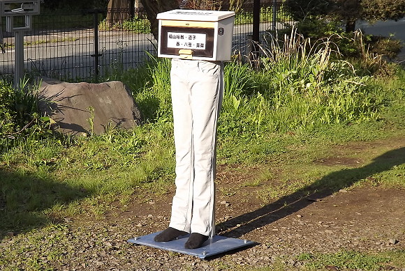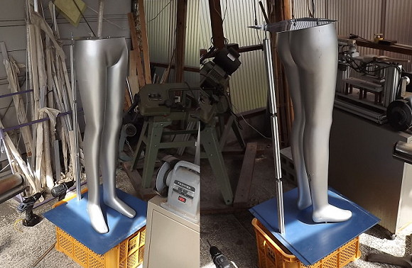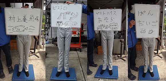 | 第107話 下半身ポスト(2015年4月) 工場勤めを辞める時、モノ作り屋はやめようと思った。当時、ものを書く面々に囲まれていて書く仕事に憧れた。次は出張多めの営業マンに憧れた。その次は一本気の旋盤職人に憧れた。経営者にもフーテンの寅さんにも憧れた。公務員だけ憧れなかった。結局色々やってモノ作り屋に戻ってきた。 どうも私は飽きっぽいらしい。隣の花は赤い現象で、楽しそうな人を見付けると隣に隣に脱線し、グルグルグルグル回り続けるらしい。 一つの事を一生やり続ける職人に憧れ、和風総本家を見ては大泣きし、真似したりしてたけど「僕にはなれぬ」と昨日諦めた。 昨日は倉庫の片付けをする日であった。倉庫に空きスペースがなかった。半日ぐらいかけて空きスペースを設け、そこに作りかけの色々を収納する予定であった。が、一歩目でつまずいた。いずれ使うだろうと保管していたマネキンの下半身を発見した。もう五年ぐらい放置されてて邪魔の極みであった。 「捨てていいでしょ」 嫁の言葉に異論はなかった。さすがにもう使わんだろうと思った。ゴミとして捨てた。が、後ろ髪を引かれ何度も舞い戻った。チラ見してしまった。誰か使ってくれる人がいるんじゃないか。自立しさえすればマネキン本来の役目も果たせるし、これに看板を付ければ人目を引く下半身ボードになるだろう。 「そうだ、お店を持ってる人にプレゼントしよう」 倉庫の片付けは脱線した。 下半身を拾い上げ、転がっていた鉄板に固定した。 マネキンの自立が危うかった。これをやるまで知らなかったが、足の裏に穴が開いてて、そこに棒を突っ込む構造らしい。これじゃ不安定で、看板としては弱過ぎる。腰を支持する補強を加え、色んな事に使えるよう上面をフラットにした。 「これなら貰ってくれるだろう!」 フェイスブックに写真を掲載し「近い人にタダで差し上げます」とメッセージを送った。 返事が来た。 「ごめんなさい、嫁が猛烈に拒否してます」 「即答します、いりません」 「これはゴミですか?」 悔しかった。確かに五年も放置され、四捨五入すればゴミだけど、ズボンを履かせて看板付けたらそれっぽくなるに違いない。 「それが分からんのかー!頼む!頼むから貰ってくれー!」 嫁の知らぬ間にソッと誰かにプレゼントする予定であった。が、こうなっちゃ、ゴミと言われちゃ後に引けない。ビジュアル的にゴミから離れるにはズボンを履かせる必要があった。嫁に事情を説明し、OL時代のズボンを貰った。 嫁は最初、怒り心頭だった。切れ気味にマネキンと接し始めたけれど、やってるうちに、だんだん楽しくなってきた。 「このズボンは看板に合わないよね、これじゃ貰ってくれる人いないなー」 色んなズボンを合わせちゃ引っ込め、最終的に最も地味な灰色をチョイスした。メインは看板。看板を引き立てる下半身が目立っちゃいけない。ナイスチョイスであった。 靴も嫁が合わせた。が、嫁はハデハデの靴しか持っていなかった。合うものがなかった。靴を諦め、靴下を履かせて誤魔化そうという事になった。 「それを履かせりゃいいじゃん」 関東出身の嫁が冷たく私を指差した。私は履いてた靴下を脱ぎ、嫁に手渡した。 「げっ!ぬるっ!気持ちわるっ!」 靴下は投げ返された。私は脱ぎたてのそれを自らの手でマネキンに装着させた。確かにぬるかった。 これにて下半身っぽくなった。 「これなら誰か貰うでしょ?」 自信満々嫁に問うた。 「誰も貰わんと思う」 却下された。ズボンチョイスに燃えた嫁も一仕事やり終え、後悔が始まったらしい。後ろ向きな事しか言わなくなった。 「私のOL時代とアンタの脱ぎ立て靴下よ、誰が喜ぶの?」 写真にモザイク入れたのに愚痴ってる感じが滲み出た。終始そういう感じであった。 保険のためにイメージ写真も撮った。知り合いの自営業が使ってくれる場面を想定し、ホワイトボードに屋号を書き「看板にしたらこういう感じになりますよ」という写真を撮った。 ああ親切。親切この上ない。これだけやれば、きっと誰かが貰ってくれるだろう。貰ってくれるに違いない。が、それでも恐ろしかった。知り合いが全滅した時のために通りから見える場所に置いた。通行人で欲しいという人がいるかもしれなかった。 すると、また嫁が愚痴った。 「子供たちがいじめられるって、見えるところに置くのはやめよう」 仕方なく前線から下げた。 話し合いの結果、「誰も貰わなかったら知り合いのお店に黙って置きに行こう」そういう風になった。 脱線は楽しい。結末の見えない行動は何と楽しいのだろう。嫁も楽しかったに違いない。ああ楽しかった。 そういえば倉庫の片付けが手付かずだった。これまでを軽く振り返るに、一度脱線すると元の軌道に戻るまで永い時間を要した。倉庫の片付けがそれじゃいけないと思った。作業場のモノを倉庫へ移さないと次の仕事に支障が出る。 「危ない危ない、またそうなるところだった」 が、ふと
