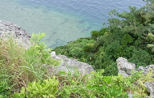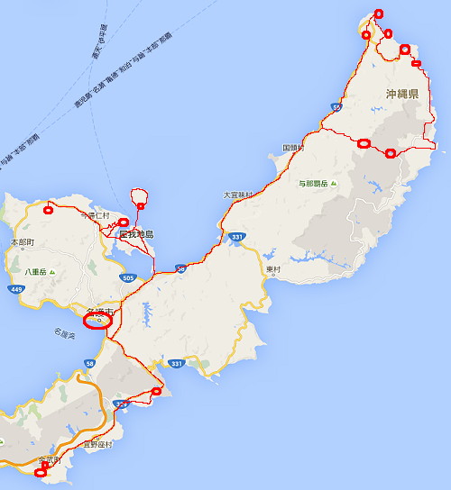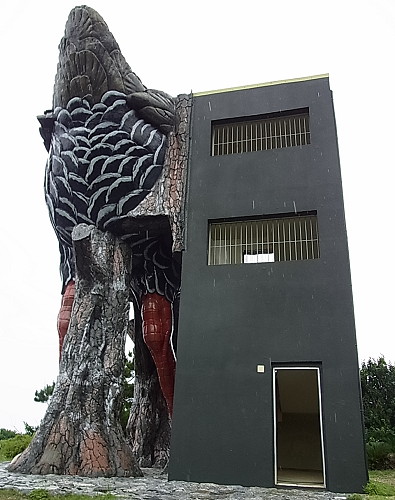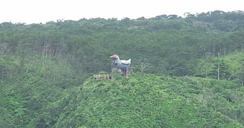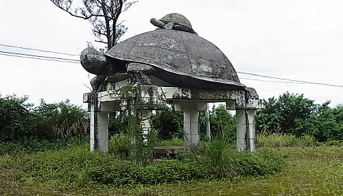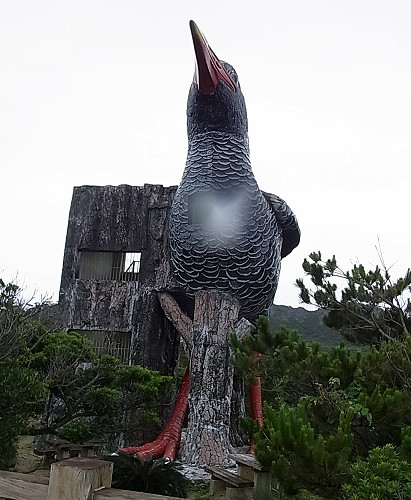 | 第119話 雨のくにがみ放浪記2(2016年7月) 昼をたっぷり過ぎてから名護の街を出た。 ひょんな事から名護に長居してしまった。これも旅の醍醐味で、決められたルートをゆく観光ツアーでは醍醐味は得難い。 この日は国頭村の奥という集落で旅人の間で名高い奥仙人に会うと決めていた。この奥仙人は噂によると5秒に1回ダジャレ、もしくはシモネタを言うらしい。 「ほんと凄いよ、マシンガントーク」 知り合いの土産話を聞いてからずっと気になってた。 事前にネットも調べた。賛否両論。ベタベタに褒めてあったり、けちょんけちょんにけなされたりしていて更に気になった。どうせ会うならそういう人がいい。万人に愛される人などつまらない。 ところで沖縄を旅するに際し、何度も何度も旅のシミュレーションをした。枕元に今昔の地図を置き、寝物語に読み耽るという作業であった。 沖縄本島は那覇周辺の南側に人がいて、北は山原(やんばる)と呼ばれ、手付かずの自然が残っているらしい。 「やんばる」 いい響きではないか。枕元で地図を見てると小型のキジみたいなヤンバルクイナがチョロチョロ走り回っている様が目に浮かぶようで何度も何度も夢の中で戯れた。 それに私は山育ちだから海より山に惹かれるたちだった。海や港(都会)は開放的で明るい人が多く、山や田舎はむっつり閉鎖的、どっちかと言うと後者が好みで、旅の面白味はそういうところに転がってると思い込んでる節があった。 「奇妙キテレツ探すなら田舎と山を巡るべい!」 そういうわけで都会は名護のみにとどめ、田舎ばかりをゆく事にした。 縦走ルートの国道58号線を真っ直ぐ北へ進み、途中絶壁を見るため山中に逸れた。 沖縄では絶壁の事をバンタと呼ぶらしい。茅打バンタという絶壁に寄った。 カップルがキャーキャー叫んで楽しそうだった。カップルの喜びを吸収すべく隣に立った。ぜんぜん楽しくなかった。吐き気がした。そう、私は高所恐怖症だった。 茅打バンタの先に本島最北端・辺戸岬があった。辺戸岬もサンゴ質の絶壁で基本視界が高く楽しめなかった。が、一箇所だけ興味深いスポットがあった。 「祖国復帰闘争碑」という重苦しい石碑があった。なぜか日本人が一人もおらず、アメリカ人だけがたくさん集まっていた。 アメリカ人はその巨大さから推測するに全員軍人ぽかった。碑文の意味は分かってないと思われた。 「ここが辺戸岬さ!イェーイ!」 そう書いてあると思っているに違いない。全員笑顔で記念写真を撮っていた。フォーフォー叫んでノリノリ。まさかこの碑が目の敵にしてるのはあなた、そう、知らぬ仏のアメリカ人とは夢にも思ってないだろう。 巨人は石碑にキスをした。台座に乗ってポーズを決めた。何だか凄い光景だった。私には石碑の声が聞こえた。 「やめろ!お前と闘った歴史を俺は忘れない!忘れぬために俺はいる!」 「ノープロブレム!イェーイ!ブッチュブッチュ!イェーイ!」 「やめろー!」 巨人の連続キスはやまなかった。私は距離を置いて観察した。 「踊ってピクチャー楽しむYO!」 終始ノリノリ、さすがアメリカ凄い国だと思った。 凄いといえば、こちらも凄かった。白光真宏会。 この団体は日本中のありとあらゆる場所に「世界人類が平和でありますように」と書かれた棒を突き刺す団体で、ここにも突き刺してあった。 歩いて行くには超難儀、崖の果てに突き刺してあって、一切文字が読めないところに意味不明の凄味を見た。 凄味と言えば金余りの余韻も凄かった。 沖縄には今も昔も基地負担の問題で大量の公金が注がれている。住民全体に行き渡ればいいが、それらは凡そ土木、箱物、観光に消えるらしい。(酔ったおじいの話) 予算を使い切れなかったらどうなるのか。とりあえず巨大なモノを作るそう。 山の方を見たら巨大なヤンバルクイナがいた。観光案内のボードによると、あれは「ヤンバルクイナ展望所」らしい。 見てしまった以上、行かねばなるまい。車を走らせた。 離合不能な狭い道路の果てにその展望所はあった。 入口(後姿)はこんな感じだった。 クイナの中に入れるかと思いきや、その隣がコンクリート造りになっていた。 回って正面から見るとこんな感じだった。 クイナはFRP製で、コンクリートに引っ付く事で倒れないようになっていた。 展望所の中は至って普通だった。無味無臭のコンクリート造りで何一つクイナっぽさがなかった。 ところで沖縄の信仰は基本自然崇拝で、ニライカナイという遠い東の海から神様(先祖)がやってくると考えるらしい。必然、陸と海の境を大切にし、海岸、及び岸壁は生と死の境として信仰的意味を持った。 「岸壁の巨大ヤンバルクイナに信仰上の問題はないの?」 近隣の海人(うみんちゅ)と呑む機会を得たので戯れに問うた。海人が言うに信仰的な事はよく分からんそう。分からんけれど海人は験を担ぐ。岸壁奥の山林は神様が来訪する場所で御嶽(うたき)と呼ばれる聖地であり、その聖地を塞ぐようにアレが見え