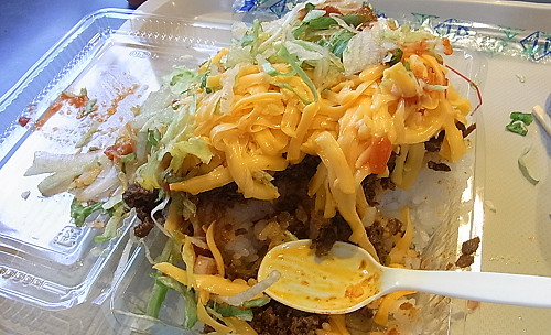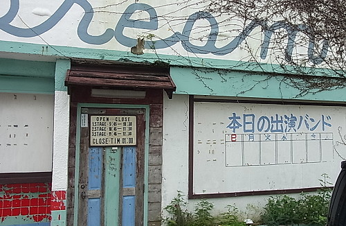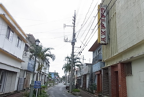 | 第122話 雨のくにがみ放浪記4(2016年10月) ちょっとだけ雨が上がった。 沖縄の晴れは海を渡って来るらしい。 遠くに白い線が見え、その線がダーッと押し寄せ晴れになった。 こうなるとタコライスなど捨てて歴史散策をしようという気分になった。古宇利島と屋我地島を歩いて一周するのも悪くない。 二つの島を繋ぐ古宇利大橋のたもとで車を降りた。と、同時に今度は黒い線が海の向こうに見えた。アッという間に暗くなった。土砂降りになった。 「こりゃダメだ」 そういう旅なのだろう。車に戻り、真っ直ぐ金武町に向かった。 金武町は「きんちょう」と読む。キャンプ・ハンセンが町の中央にあって、海沿いだけがニッポンの金武町になっている。 キャンプの入口周辺が米兵向けの歓楽街「新開地」として発展し、これから目指すタコライスもそういう流れで誕生したらしい。 雨なのでどこにも寄らず向かったら9時過ぎにはタコライス屋に着いた。店名はキングタコス。10時半に開くらしい。 「さて、何しよう?」 傘を差してブラブラしてたら「アメリカ出て行け!」と叫んでる集団と会った。暇だから気の良さそうな人に抗議の内容を聞いた。内容はよく分からぬが、とにかくキャンプ・ハンセンを起点に海岸沿いを隣のうるま市まで歩き「アメリカ出て行け」と叫ぶそう。 「午前中いっぱい歩きます」 「雨の中お疲れです」 「ホントお疲れ、困ったもんです」 こういう集団は全員がノリノリかと思いきや付き合いで仕方なく付いて来ている人もいるらしい。テンションの差が激しかった。 一番やる気のなさそうな人に金武町の歴史スポットを聞いた。観音寺を紹介された。 「地下の洞窟がすごいですよ、雨でも見れます、必見です」 集団は南へ向かって行進を始めた。 「アメリカ出て行けー!」 私は集団と逆へ動き、集団から離れた。遠目に見て可笑しかった。人数は30人ぐらいか。熱量の順に並んでて後ろはほぼ寝ていた。 街から徒歩10分ぐらいのところにオススメの観音寺があった。「金武町イチ立派な寺」という話だったけれど地上の拝殿は小ぶりなそれでこれという特徴はなかった。 変わっていると言えば地下に金武宮という本殿があって、拝殿隣に洞窟の入口があり、中は鍾乳洞になっていた。 数名の観光客がいた。その中に若いカップルがいて「だまされた」と嘆いた。何を言っているのかよく分からなかったが、洞窟を出、寺の貼り紙を見、「なるほど」って唸った。 メディアが作った子宝観音を目当てに観光客が押し寄せるらしい。 「そんなのない!絶対ない!うちゃ知らん!」 万物がメディアとカネに寄る昨今なかなか言える事じゃない。感心した。賽銭箱に300円入れて帰った。 雨が上がった。 タコライス屋の開店までもう少々時間があった。 昭和に作られた米兵向け歓楽街をくまなく歩いた。 歩いて分かったが、なぜ私はここを知らなかったのか。下調べの弱さを猛烈に悔いた。昭和が無造作に捨てられていてモロ私の好みだった。 「この街は夜歩きたい!酔った体で!」 車だから酒を呑むわけにもいかず、宿も隣町に取っていてどうしようもなかった。 立ち止まっては「うー!」って叫んだ。嘆きの嗚咽がやまなかった。 更に歩いた。何だろうこの感じ。寅さんのヒロイン・リリーがいるんじゃないか。後で調べたらシリーズ最高傑作「寅次郎ハイビスカスの花」のロケ地だった。 「うー!」 タコライスなんてどうでもよくなった。既に開店時間は過ぎたけど「うーうー」歩いているうちにすっかり忘れた。 地元のばあさんに会った。今も昔もここ新開地で働いてるらしい。 「今はぜんぜんだけど昔はそりゃすごかったよ、この通りが体の大きな外人さんでいっぱいになって毎日がお祭り騒ぎ、ちょっと名残があるだろ」 「あるある!」 名残で酔えるのは日本人の特権かもしれない。名残で酔いたい叫びたい。ぐでんぐでんになって「憧れのハワイ航路」でも歌いつつ昭和にもたれて歩きたい。 古宇利島の人が「沖縄に来たら金武町のタコライスを食わなきゃ」って言った時、私は「えー」って叫んだ。「ウチナンチューにブームのファストフードを食っても旅の醍醐味はないでしょー」って思った。が、オーナーは50回もタコライスの素晴らしさを語ってくれた。 「語ってくれてありがとう!語ってくれて今がある!」 ちょうど歩き疲れた頃、タコライスの事を思い出した。 タコライスはポッと出じゃない。戦後の金武町が土地を奪われ何とか食おうと歓楽街を築き、あがいた末の沖縄の、沖縄による歴史的産物。 「これはマックぽいけどマックとは微妙に違う!テビチ、ソーキ、もずくに並ぶ沖縄のソウルフードだ!」 街歩きの余熱をもってタコライス屋に突入した。 店構えはファストフード店の典型で、カウンター越しにマニュアルっぽい日本語で注文を聞かれた。 メニューはこれもファストフード店の典型で壁に書いてあった。私は壁に書かれたカタカナ語をジッと眺め、そもそもタコライ