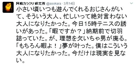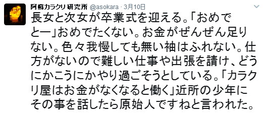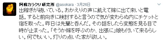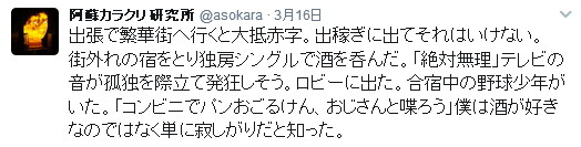 | 第127話 信じられない寂しがり(2017年3月) 自分の適性を知る事が人生を有意義に過ごす要諦だと思っている。従って自分に対する研究はそれなりにやったつもりでいるし、そうやって今を作った自負もある。が、寂しがりという点において少々認識が甘かった。分かっちゃいたが、信じられない結果を叩き付けられ自分が一番驚いた。 二月の頭ぐらいであろうか「三月四月は金がかかる」と嫁や友が言うのを聞いた。卒業入学はとにかく金がかかるらしい。 私は娘の教育に無頓着で、どれくらいかかるのか全く想像つかずザッとたずねた。友の話によると二十万ぐらいはペロッとなくなるらしい。 「お前のところは中学高校ダブル入学だろ、大変だなぁ」 「ちょっと待て、四十万ぐらい現ナマがいるという事か?」 「学校によっても違うけど最低それぐらいは」 「ない!うちにはない!ない袖は振れん!」 急に言われても本当にない袖は振れない。嫁はお気楽の極みなので「何とかなるさ」の一点張り。考えるという人間の基本性能はとうの前に捨て去り、川の流れに身をまかすという大乗仏教の悟り人みたいになっていた。 「危うい、危ういぞ!うちの嫁の事だ、ないなら実家に借りればいいじゃんとか言うに違いない!男のプライドに危機到来!」 そんな折、出張仕事の打診があった。17年前に作った機械を新しい電用品で全面リニューアルするらしい。機械と電気は装置メーカーでやるからソフトウェアの作成と立ち上げをやって欲しいと言われた。 電用品は年々リニューアルされ、ちょっと触らないと取り残され感ハンパなく、やるには資料を読み込む必要があった。正直それが面倒臭いし、ソフトウェアという作業が年々辛くなる昨今でもあった。極め付けは立ち上げ出張二週間、果たしてこの寂しがりに耐えられるのか、それが最も危惧された。 悩んだ。が、娘の入学は待ってくれない。男のプライドを死守する必要もあった。嫁に相談しても「断るな」と言うに違いなく、事実「絶対断るな」と言われた。 「やります!やらせて下さい!」 請けた。 電話を切った後、その辺にいた近所の子供が「カラクリさんも働くんですね」と言った。その事はツイッターに書いた。 三月は勉強と出張に費やした。 数日あれば終わると思った勉強も想像以上に意味不明で倍の時間を要した。 焦った。出張前日なのにソフトウェアの叩き台が終わらず久しぶりに徹夜を覚悟。が、私の意志の弱さは筋金入りで、中学生からテニスに誘われると喜び勇んで付いてった。 結局、疲れて眠ってしまい、やりかけの状態で出張に出た。 ちなみにその日は長女の高校受験合格発表だった。長女は近所の公立高校を受けた。最初は受かって欲しいと人並に思っていたが途中改心した。 「名前書きゃ受かる学校だから、ま、余裕でしょ」 全く勉強しない長女の物言い腹立たしく、言ってはいけないと思いつつ「お前の人生のために落ちた方がいい!落ちろ!落ちて皆から笑われろ!」言って嫁に叱られた。 出張先は新門司だった。大都会小倉の裏側に位置し、フェリー乗り場を囲むように工業団地があり、それ以外は何もなかった。よって普通の出張者は小倉駅前に泊まった。が、私は駅前を避け、合宿所のような郊外のホテルを選んだ。 ツイッターの貼り付けが便利なのでそのままペタペタ貼る。 びっくり。11平米の独房シングルに一人でいると気が狂いそうになった。いつもは酔って寝るだけだから気にならないが素面の独房はいけない。即座にコンビニへ走り、缶ビールとワンカップを買った。 事前に「ホテルでの過ごし方」を色んな大人にリサーチしていた。それによると誰にも邪魔されずテレビを見、静かに酔って寝落ちするらしい。家ではありえない充実した一人の時間を満喫するそう。 マネした。テレビもつけた。 酒を呑むゴクッゴクッという音が独房に響き、テレビの音がガヤガヤ鳴った。ゴクッゴクッ、ガヤガヤ、私が動くとベットのスプリングがギーギー鳴り、外から救急車の音が聞こえた。 隣から物音がした。誰かいる。誰だろう。耳を澄ますも聞こえなかった。 酒を飲み干した。テレビのガヤガヤが人間の気配を吸い取っているような気がしてテレビを消した。 「このガヤガヤはニセモノ、ニセモノは苦しい、本物のガヤガヤが欲しい」 テレビはいけない。テレビが怖くなった。酒も変な感じで回った。頭ばかりが痛くなった。近所に呑み屋はなかった。それを確認してこの宿をとった。 「もうちょっと呑もう」 とりあえず部屋から出た。しっかり酔わねば独房で孤独死する可能性があった。ロビーに野球少年が三人いたので話しかけた。長崎から来たらしい。前述のように「パンをおごる」と言ったら更に五人増えた。八人の少年を引き連れコンビニへ行った。1200円分のパンと冷酒を買って宿の前で呑んだ。 少年達と野球や恋の話をした。もっと話したいのに少年たちはサッと食ってサッと帰った。 「もっとご馳走するから付き
