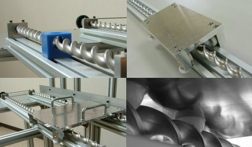 | 第137話 愛搬送マシーン(2018年6月) 高専の先輩にねじり板金屋さんがいる。 鉄の板をぞうきん絞るみたいに捻り、高精度なネジを作る。何に使われているのかというと太陽光発電の基礎で、大地にねじ込んで使う。 [使い方を間違えた捻り板金] これが売れに売れたそう。が、一気に売れるモノはスッとやむ。売電価格の低迷でアレは何だったのかと思うぐらいピタッとやみ、増強した生産能力に空きが生じてしまったらしい。 先輩は呑みながらこう言った。 「なんか使いみち考えて」 先輩は相談する人を間違えた。が、酔ってた事もあり「考えます」って言ってしまった。 それから数日考えた。地面にねじ込む以外に何か用途はあるだろうか。 実は11年前にも同じような事を考えた事があって、その時は2本のねじり板金でミカンを潰して搬送したり、粘性体(その時はアイス)を押し出す構造を作ったりした。これがなかなかの失敗に終わり、唯一注目を浴びたのが簡易搬送だった。 簡易搬送は一般的に送りネジを使う。送りネジといえばボールネジ、少し安いのが台形ネジ、それに代わる更に安いネジとしてねじり板金を使った。 [ボールネジと台形ネジ] [ねじり板金を使った簡易搬送] これはなかなかよく出来た。色んな人が「売ってくれ」と言ってきた。が、売れなかった。このタイミングで前職をクビになり、クビついでに阿蘇カラクリ研究所を創業した。 そういう経緯もあって「もう一度簡易搬送に挑戦しよう」という運びになった。尚、簡易搬送だけじゃなく「他にも使いみち考えて」と言われたが、そこは前回懲りた事もあり、 「賞金出して募集しましょう」 つまり他力本願で行こうと提案し了承された。 とりあえず発表の場がいるので日本最大のモノづくりフェスティバル「メーカーフェア東京」に応募した。これの書類選考に合格したら試作に着手と約束し、先月着手に至った。 それから簡易搬送の事をぼんやり考えている。 簡易搬送の要は送る構造とコストに尽きる。構造が決まってしまえば後は金型作ってナット(動く部分)を成形するのが一番安く売れる。が、金型製作はまとまったカネがいる。自慢じゃないが私はカネがない。先輩に軽く打診した。 「俺もカネがないからお前に相談したんじゃないか、そこを察せ」 何も言わないけど顔にそう書いてあった。カネはないと察した。 金型の見積もりも試しに取った。見た瞬間ムリだと分かった。潔く諦める事ができた。 「作っちゃいけない削っちゃいけない、世の中にある一番安い部品で試作するんだ」 引き出しに使われるコロコロや樹脂パイプを使って11年前よりも簡便で安っぽい構造を目指した。 ガイド(土台)は平成のメカ技術者なら誰もが一度は使った事ある工業用アルミフレームと決め、モノに合わせて何十種類も試作した。 ところで試作という作業は実験の数が増えると何がいいのかサッパリ分からなくなる。悪いモノは潔く捨て、モノは捨てても結果だけはデータとして残し、そこにコストという制限を突っ込み、いいところを模索する。機能ばかりを追ってもこの作業は永遠に終わらず、コストばかりを言っても全く先に進まない。落とし所を探すのが試作という作業で、本来なら客に試作費という大枠を頂いて着手するのが筋。が、そこは先輩後輩・酒場会議の悪いところで何の相談もせず勝手にジャンジャン進めた。 「まぁ実費ぐらいは払ってくれるだろう」こっちはそんな思いだし、向こうは「まぁ悪いようにはせんだろう」そう思ってくれてると信じている。 で、作った試作第一号が手動式愛搬送マシーン。たくさん作った搬送系の一本を愛搬送仕様に改造した。 これは先輩も不安になった。なぜ搬送するモノが愛なのか、それ即ち「嫁とイチャイチャしたい」それが理由だけど、そんな理由は知ったこっちゃない。 「マジメにやってるのか?ふざけてやってるのか?」 「むろんマジメです」 「マジメならいい」 そういう問答を経て試作の続行を指示された。 愛搬送マシーンは意外と好評だった。送り構造の試作だから語るべきは搬送の仕組だけれど一般の人に仕組の説明はいらない。何をどういうビジュアルで運ぶかが重要であって、プライスレスの愛を安い構造で運ぶ試みは愛を求める民衆の心を打った。動画を載せたら色んな人から「タダでくれ」と言われた。 「俺も安っぽい愛を安っぽく運びたい」 愛を求め続ける北斗の拳ファン(同世代)の意外な反応を受け私は味を占めた。 「電動版も作ろう」 仕事そっちのけで夜な夜な電動版の図面を描いた。描いた後やっぱりBGMが欲しくなった。MP3再生器を買った。買った後お金の事が心配になって念のため先輩に聞いた。 「予算ですが、このくらいは使っていいですよね?」 「…」 先輩は数日沈黙した。沈黙の後、 「やってくれ」 涙ながらにそう応えた。 それから音の選択に悩んだ。愛を伝える音って何が正解だろう。一方通行ではいけない。愛搬送マシーンは行ったら戻って