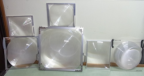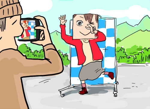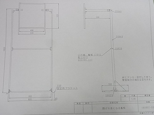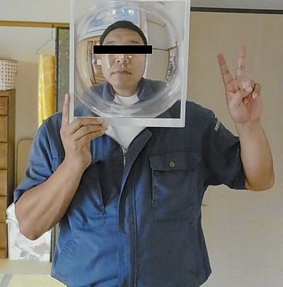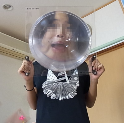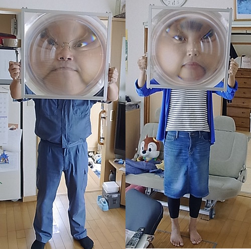| 第139話 顔が大きくなる板(2018年9月) 先日メーカーフェアで顔が大きくなる箱というのをかぶった。 本当ならかぶりたくなかった。そんなモノかぶらなくても私は顔がデカいと言われていて、小さくなるならまだしも、わざわざ大きくする必要性を微塵も感じなかった。が、知り合いの林さん(インターネット新聞の編集長)が嬉しそうに「どうぞ遠慮なさらずかぶって下さい」と言うのでしぶしぶかぶった。 周りは盛り上がった。当然、顔が大きくなって盛り上がってると思った。が、レンズが天井の灯りを反射し、鼻からビームが出たみたいになって盛り上がっていた。 「顔の大きさはどう?」 隣の同級生に聞いた。 「うん普通、変化なし」 顔が大きくなる箱なのに鼻からビームでのみ笑われ、誰も顔の大きさには触れてくれないというまさかの事態に陥った。 それから数日後、あれはそう、顔が大きくならない悔しさを忘れかけた頃、衝撃のデジタル技術を娘に突き付けられた。SNOWという画像をいじるソフトで、瞬時に顔を認識し、おもしろ写真に変えてしまうらしい。 私はスマホが嫌いだ。むろん持ってないし、アプリとかインスタとか言われても意味不明。デジタル技術じゃ笑わない自信があった。が、笑った。 三女と実父の変形写真にクスッとしてしまった。 「悔しい!もう二度と笑わない!」 誓った次の瞬間、今度は二人の顔を入れ替えるという反則技が来た。なんと実父と四女を入れ替えた。 「むふー!ゲホッ!」 こらえたぶんだけ本気でむせてしまった。ぬらりひょんと宇宙人じゃないか。悔しいけれど最高だ。デジタル技術はもうここまで来てるのか。 アナログのピンチを感じた。そして顔が大きくなる箱を思い出した。 「あれは単なる箱じゃない!SNOWと戦ってんだ!アナログ vs デジタル、全面戦争の幕開けだ!負けるわけにはいかない!僕も作るぞ!顔が大きい人でも大きくなったのがハッキリ分かるの作る!」 そういえば「おもしろ看板を考えて欲しい」という軽い相談が来ていた。これと絡めればチャレンジが仕事になって材料費が見てもらえるかもしれない。 「顔が大きくなる看板はどうだろう?」 既存の箱は箱ゆえに両手が自由にならずポーズが決められないという欠点があった。自由になるようレンズを浮かせたところで固定し、背景を記者会見みたいな市松模様(宣伝入り)にしたらどうか。 図面を描き、知り合い数人に打診した。このチャレンジが趣味となるか仕事となるか、真剣勝負だけれど誰もピンと来なかった。 「顔が大きくなって何がおもしろいの?」 確かに何がおもしろいのか私自身がよく分かってなかった。分かってないけど想像するにおもしろく、おもしろいからおもしろい専門の林さん(インターネット新聞の編集長)もハマっているのだろう。 「で、それ作るとして幾らぐらいかかるの?」 「えっ?」 「耐久性は?」 「んー?」 客との問答を繰り返し、こりゃ試作せんと話にならんと思った。思ったついでにパイオニアの林さんに連絡し「作っていいですか?」と聞いた。林さんはオープンソースという外来語を使って承諾し、作り方が書いてあるページを教えてくれた。 大変参考になった。レンズがどこで買えるかも書いてあり、そのレンズが意外と高級品だという事も分かった。 「どうせやるなら色んなレンズを試したい」 ペラペラの安いヤツから林さんが使っているちゃんとしたヤツまで幅広く買った。 「何がどうおもしろいのか?」 作って売るからには作る本人が分かってなきゃならない。まずはレンズ単体でおもしろい絵を探求した。が、この「おもしろい絵」にはそれなりのセンスがいるらしい。私と嫁が何十枚撮ってもおもしろくならず、三女が撮ると一発でおもしろい絵が撮れた。モデルをさせても撮らせても三女がやった時だけおもしろくなった。 「SNOWだって普通に撮ったらおもしろくないとよ、おもしろく撮らんとおもしろくならんと」 娘の日本語が心に沁みた。デジタルの申し子・小6三女に完敗だった。三女を師と仰ぎ実験を進めた。 まずレンズ。これは体積がほぼ値段になる。200mm角0.5mm厚(1000円弱)から500mm角2mm厚(10000円弱)まで買った。厚いと歪みが減ってクリアな視界になる事が分かった。 三女にひとしきり暴れてもらい色んなレンズで撮った。 サイズは大きければ大きいほどいいと思っていたが身長160センチぐらいの人には400mm角ぐらいが適当で、それより大きくなるとおもしろくない事が分かった。 何事も加減が大事らしく、ある一定の線を超えると「それは違う」と脳が認識するみたいで赤ちゃんの体に私のサイズを乗せてもヘタクソな合成写真みたいになってリアリティーが失せた。 尚、実験はすぐに飽き、四女の撮影会が始まった。おもしろいだけじゃなく、かわいい写真が撮れる事も分かった。 次に「取り扱い」という点でレンズは色々面倒臭かった。やっぱり触っちゃいけないし、樹脂だから傷も付きやすい。衝撃を与えると割れる可能性だってあ