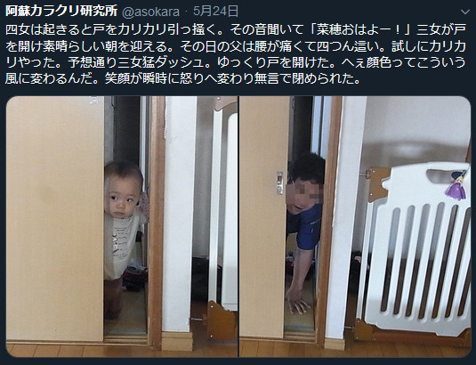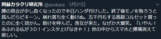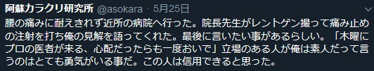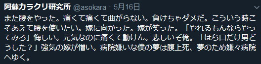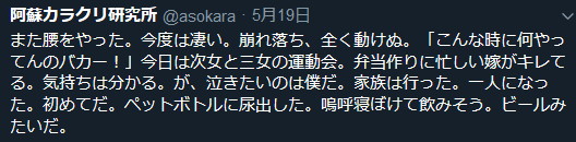 | 第145話 腰痛物語2(2019年7月) 二ヵ月半、生きる醍醐味を書かなかった。 なぜか? 腰が痛くて長時間パソコンする気分にならなかった。 手帳によると令和元年になった瞬間(5月1日)から痛み始め、5月12日、もうどうにもならず前回(腰痛物語1)お世話になった気功師に頼った。が、今回は効かなかった。 振り返りながら過去の記録を見た。毎日書いてるツイッターにもその苦しみが見えた。 5月16日、こうなったら何でも試そうという事で近所の整体屋に行った。 効いたのか?効かなかったのか? よく分からぬまま5月19日、その日は次女と三女の運動会だった。嫁は大忙し。4時起きで弁当を作ってるところに最強の一発が来た。 ピキーン! その時、僕は何をしてたのだろう。分からない。記憶に残らぬほど何もしてない時にそれは来た。 突然80キロの巨体が崩れ落ち、全く動けぬ肉の塊になった。 「はー?何やってんのー?」 「ギックリ腰デス」 「こんな時にふざけんな!もー!」 嫁は怒り狂った。運動会の弁当準備が間に合わない。が、床に転がる肉の塊もほっとけない。揚げ物の火を止め、肉の塊を子供と一緒に布団へ運んだ。 「どうすんのよ!あーむかつくー!」 嫁は暴れながら優先順位を決めた。イチに弁当、二に弁当、とにかく弁当を仕上げないと運動会が始まっちゃう。 肉の塊も徐々に焦り始めた。 「マジで動けん、こりゃ大変だ」 腰が動かなくても手と足が動けば移動はできると考えてる人は多いだろう。僕もそう思ってた。が、亀を見て欲しい。引っくり返すと動けない。ゆえ、うつ伏せになって匍匐前進で進むカタチとなるがめちゃくちゃ痛い。泣くほど痛い。ウミガメの出産シーンみたいに首だけ上げて泣くばかり。一歩も動けず不安ばかりが募った。 運動会の時間になった。 弁当は間に合った。嫁が荷物を積みながらこう叫んでいた。 「駐車場からグランドまで誰が荷物運ぶんだよー?」 僕という存在はそれだけの存在らしい。布団の中で泣いていたら実母と長さん(僕の同級生、娘が運動会に呼んだ)が来た。実母は心配してるフリしながら笑い、長さんは大急ぎで車へ走りポラロイドカメラを持って来た。 「大変だ!記念撮影しなきゃ!」 僕の写真を記念にくれた。 「こんなのいらん」 返したけどムリヤリもらわされた。 それから一人になった。みんな運動会に行った。 心配な事が一つだけあった。動けなくても出るものは出る。やっぱり来た。使いたくなかったけど尿瓶に手を掛けた。 「ここ置いとくね」 嫁がウイスキー用のペットボトルを枕元に用意してくれた。実母が「ペットボトルじゃチンコが入らん」と腹を抱えて笑ったけど「4リットルのペットボトルだから大丈夫です」と嫁が返した。スポスポだった。 その日のツイッターにこんな事を書いてた。 これを読む限り実に平和だ。 なぜならツイッターは小しか触れてない。大は悲惨で、その格闘は壮絶。140文字じゃ書けなかった。こればかりはペットボトルに狙い打てない。むろん最初は我慢した。第一波も第二波も乗り切った。が、第三波が大津波だった。 目はギンギンに見開き、全身あぶら汗でグッショリ、腰から抜け落ちた筋肉は全て括約筋に流れ落ち、全神経・全思考も「肛門」それ一つに集中した時、動けぬ肉が動き出した。 四女のオムツがそこにあった。そこにしよう。手に取った。が、サイズ的にはけるのか?容量は足りるのか?そもそも、はく動作ができるのか?次から次に疑問が湧いた。 「ムリだ!」 手にしたオムツを放り投げ、8歩先のトイレを目指し、ジリジリ匍匐前進で進んだ。ゆっくりゆっくり進みながら曽祖父が言った言葉を思い出した。 「わしが一人で厠に行けんごつなったら必ずわしを殺せ」 僕が小学校の低学年、曽祖父が95歳ぐらいの時だと思うけど「一人で飯とクソができなくなったら死んだと見なして殺せ」と言った。なぜ今頃そんな事を思い出したのか。それ即ち排泄という作業が生きるか死ぬかのボーダーだからに違いない。 「じぃちゃん、おら生きてぇ」 肉の塊はナメクジさながら便器に達し、両手をピンと張り、腕力のみで腰を上げ、やっとの事で便座に乗った。 「なせばなる!なさねばならぬ何事も!ならぬは人のなさぬなりけりー!ぶりぶりぶりー!」 曽祖父は曾祖母が亡くなった後、後を追うよに老衰で逝った。有言実行、直前まで自分で食い自分で出した人だった。 「おらもじぃちゃんみたいになれるかな」 達成感に泣いてしまった僕はすぐそこに次の山がある事を知らなかった。 「げ!尻が拭けねぇー!」 ギックリ腰の経験者は声を揃えて言う。 「はい、尻が拭けません」 軽度でも拭けないから重度のギックリは話にならない。どんなに頑張っても手の平一つぶんぐらい肛門に届かなかった。 座って拭くのは諦め、また腕力のみで便座を離れ、うつ伏せの姿勢になった。が、それでも届かなかった。 体の事をこんなに考えた時間は今までなかった。腰がピンと伸びたまま右手を肛門へ差し出すにはどう