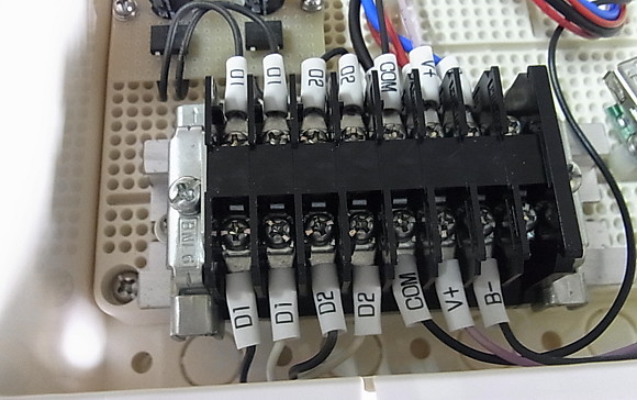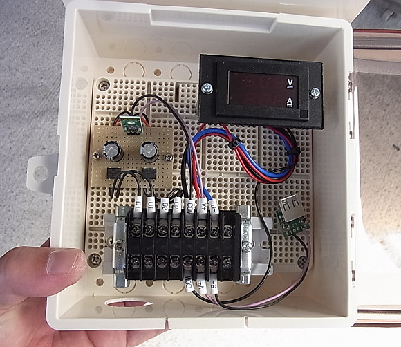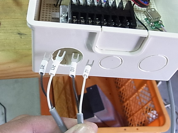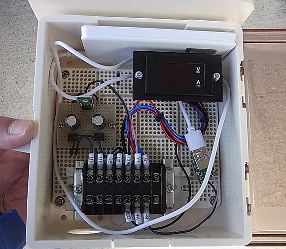 普通は上のような状態で届きます。 D1端子にハブダイナモ1の出力をD2端子にハブダイナモ2の出力を繋いで下さい。水車とボックスを一緒に買って頂いた場合マークチューブを付けてますのでマークチューブに合わせて繋いで下さい。 上の写真のようにボックス下からケーブルを入れ、フォーク端子を突っ込んでネジを締めます。 ハブダイナモの出力は交流なので極性はありません。 空間が狭くて作業がやり辛い場合は取付板を外して下さい。四隅のネジを外すと取れます。 USB出力はモバイルバッテリーの充電用です。 モバイルバッテリーの入力端子に合った中間ケーブルを噛ませて接続して下さい。 モバイルバッテリーは薄くて小さいのを買うとボックス内に収納できます。 モバイルバッテリー付きで納品して欲しいという事でしたら+2000円で承ります。価格は以下のようになります。 標準ボックス:22000円(税別) 標準ボックス+モバイルバッテリー:24000円(税別) 一点、取り扱い注意ですが色んな現場の水車を見ながらDC8〜10V程度の出力を想定してます。DC/DCコンバータの入力はマックスDC14Vなので普通に使うぶんには問題ないのですが手で思いっきりブン回されるとDC14Vを超えてしまいます。若い学生が思いっきり回してコンバータを壊すという事例が発生しました。ご注意下さい。 尚、必ず出荷試験をしてから出してます。手で回す時は水車が水で回る程度のスピードでゆっくり回して下さい。動かないのは初期不良ではなく思いっきりブン回したからです。 以上、よろしくお願い致します。 |
