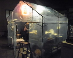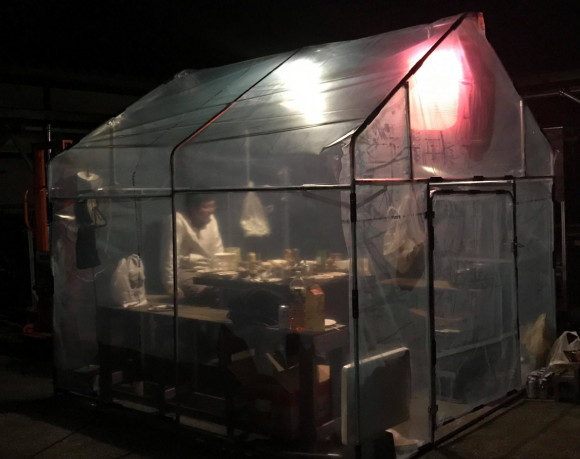 | 〜2017年12月13日〜 暗くなってもやりたいので電灯を付けました。ついでに赤提灯も付けました。「赤提灯はいらん」と色んな人に言われました。いります。 |