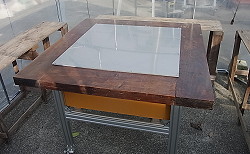 | 〜2017年12月30日〜 普通の机としても使えるようにキッチリ寸法測ってフタを作りました。耐食性を考慮し、ステンレスにしました。 「は?いくらかかったと?」 何をやっても嫁と娘はイラッとするそうです。 |