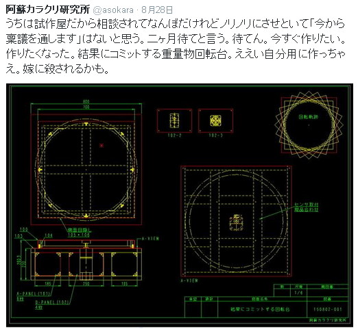 | まずは8月28日のツイート(ツイッターへの投稿の事)を見て欲しい。 初めてのお客さんに「面白い看板を一緒に考えてくれ」と相談され、本気で考えノリノリになったところで、おあずけを喰らってしまった。 こういうパターンはいけない。毎度おなじみドツボにはまるパターン。 「興奮しちゃいかん!」 いかんいかんと思いつつ、その夜、図面を描き、翌朝には部品を発注してしまった。 部品が全部揃うまで凡そ一週間。一週間という時間は僕を冷静にした。 「なぜ、こんなモノを作ろうと思ったのだろう?」 が、遅い。既に発注済で後には退けない。 「そうだ、スポンサーを集めよう!」 お金を出してくれそうな知り合いに、 「重量物用回転台、欲しくないっすか?僕、欲しいっす!材料代を出しませんか?二人の共有財産にしましょう!」 片っ端から持ちかけた。が、断られた。そう、片っ端から断られた。 「さて、どうしよう?」 材料表を見ながら、後に払う金額を計算した。 「むむむ!」 いつもはコスト優先の華奢設計のくせに今回はやたらガッチリ設計していた。 あの日の僕はどうかしていたらしい。やたら剛性にこだわり、ガッチリむきむきであった。 「大人2人が乗れんといかん!耐荷重200キロ!」 思い描いた絵があった。 かつらの人と潔いハゲに乗ってもらい、その男気を回転で披露。むろん、あの音楽が付帯し、堂々ハゲを煌びやかに持ち上げる。 女性でもいい。色んな面で対照的な二人に乗ってもらい、夢と希望を回したい。 一人で回ってもいい。モーターを変速仕様にし、思いっきり遅くすれば半周のうちに着替えもできる。ヒーローにだって変身可能。先ほどの事例なら思いっきりズラを投げ、服も脱ぎ捨て裸になればいい。 「大変身を一回転で示したい!」 そういう回転台が欲しい。 あの日の僕のメモ紙が手元にある。 「大人二人が乗れる」 「変速モーター」 「音楽付帯」 「正面認識」 「背面認識」 「スポットライト」 色んな事を加味したらアッという間に部品が増えた。で、迷わぬうちに発注した。 数日後、案の定、迷いの嵐が訪れた。 「俺のバカー!」 部品が来た。 涙を堪え組立に着手した。着手して分かった。重過ぎて持てなかった。地べたで作っても運べないだろう。ハンドリフトの上で組んだ。組みながら思った。従業員もいないのにどうやって現場へ運ぶのか。車に積めたとしても行った先で降ろせない。 とりあえずカタチになった。 ブロックを置き、ハンドリフトのツメが入る状態で地上に降ろした。 「スイッチオン!」 テーブルが回った。ビックリ。回転が速過ぎた。 一晩でエイヤと作ったモノは色んな事が想定外だった。あの日の僕はどんだけ寝ぼけて計算したのだろう。この回転は立っていられるはずがない。 ちょうどガチャガチャやってる時に三女が来た。立つのは危険なので座ってもらった。(動画参照)三女は開口一番「気持ち悪い」と言った。最速で回した。三女は人である事を捨てモンキーになった。キーキー鳴いた。 農作業後の嫁にも乗ってもらった。(動画参照)速効で気分が悪くなるらしい。寝込んでしまった。 とりあえず、このスピードは使い物にならんという事でギア比を1/50から1/180に落とした。落とした上で前と後ろを感知するセンサを現品合わせで取り付けた。乗ってる人が後ろ向きの時に悲しい音楽が流れ出し、前向きの時に明るい音楽が流れるようにした。 看板屋と話したのは、これに精巧なマネキンを2体乗せ、それぞれに善と悪の色々を施し、使用前使用後の変化を如実に感じてもらうというもので、飲食店なら食べる前と食べた後で幸せそうな具合を変えたり、メーカーなら「この商品を使うとこれだけ変わる!」というのを大袈裟に示せばいいと盛り上がった。 「かぶるだけ塗るだけで結果にコミット!そんな感じはどうだろう?」 「ウケる!最高!いいっ!早速作ろう!作りたい!」 そういう感じで大盛り上がり。盛り上がって膨らんで「これが街角にあれば通行人は勝手に乗る!勝手に写真も撮るでしょう!ステッカーを貼れば広告代が入るかも!」 話は脱線。大きく歪み、更に邪悪に盛り上がった。 僕には、あの興奮を抑える事ができなかった。稟議が下りるまで「たった二ヶ月待て」と言われ、それを突っぱね動いてしまった。 「待てん!ムリ!自分用に作る!」 僕はバカだ。ほんとバカだ。 そういう流れでスタートし、カタチになってしまった。(動画参照) これに外装を整え、装飾を施せば完成となる。 が、保管場所の問題と想定外の材料費、そして輸送手段、更にこれが本筋、活用法すら決まってない。 「これをどこでどう使うのか?」 色んな順序があべこべだけど作ったものはしょうがない。使うしかない。 無表情の嫁も怖い。最近変わった仕事が多かったから、それの一つと勘違いしてたみたいだけれど、音を入れた時点で、 「ん?」 二度見していた。嫌な気配を察したらしい。 とりあえず、この回転台は9月19・20日の山口ミニメーカーフェアに