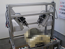 | (67)多方向同時穴あけ機 穴あけ機は過去に幾つか作りましたが、3Dの製品に4穴一気にあける機械は初めてでした。うちは2DのCADしかないので3D部品は金型屋さんに設計からお願いしました。おかげで調整もスムーズにいきました。3Dの部分はいつも「現品合わせ」としていますが、やっぱ図面で追い込むと調整が楽ですね。更に3D部品が肉厚なので「ガンダムみたい」と思っていたら長女も同じ感想を漏らしました。カッコいいという事だと思います。 ちなみに今回の仕事は機能部のみをアソカラで作り、メカの調整、安全対策、切子対策を客先でやるという段取りにしました。当然手離れが良く、価格に反映されました。お互いにとって良い流れだったと思っています。 |