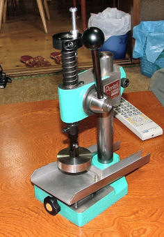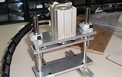 | (41)簡易式エアプッシャ「押すだけ君U」 ピンを圧入するための産業用エアプッシャです。 ガイドがあるので真っ直ぐ押せます。 操作はフットスイッチです。 部品はアルミです。 単純明快。何の工夫もない「押すだけ君」です。 |