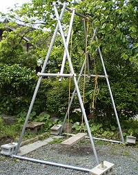 | (50)チェーンブロック用の架台 軽トラの荷台をズボッと突っ込みチェーンブロックで引き上げるための架台を作りました。すぐさま子供の目に留まり、案の定「ブランコを作れ」という流れになりました。気が付いた時にはブランコ専用架台と化し、チェーンブロックは取り払われました。 荷物引き上げとして使う事は稀なので一石二鳥で良かったのかもしれませんが、遊具に占拠されていくカラクリ屋の風景は何とも複雑です。 動画はこちらをご覧下さい。 |