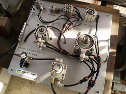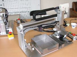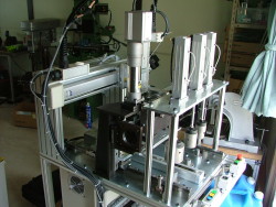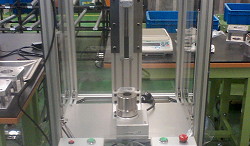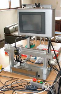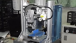 | (87)極小深穴接着剤塗布装置 小さくて深い穴に接着剤を塗布する装置です。Z軸と回転軸を簡易制御しています。 この装置の心臓部「塗布ノズル」は外で加工すべく図面を描いたのですが、どこも加工してくれず自作の運びとなりました。結果、意外とうまくできました。 ノズルが華奢なのでクラッシュ一発即大破、おっかなビックリ、スリル満点のマシンです。 |
