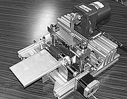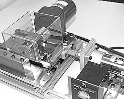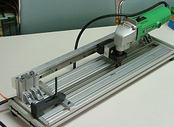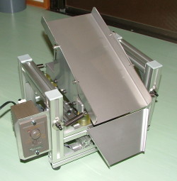 (11)オフセット式連続切断機「南斗水鳥拳」 直刃が上下運動を繰り返します。それと同期しながらステッピングモータがワークを送り出します。 極めて薄いファインカッターがワークに無数のスリットを刻み込む。刻んだスリットは目に見えず、むろんワークも気付いていない。全てを終えた静寂の後、パラリ見えたよ、スリットが。 超硬製薄刃の可能性に挑戦した展示会用実演機です。 |