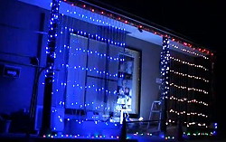 | (86)垂れ幕連動型イルミネーション 嫁子供が「イルミネーションを飾って欲しい」と言ったので普通に飾りました。すると近所の人が「普通ですね」と言いました。普通嫌いのアソカラとしては普通じゃない要素を入れねばならず無理矢理「韓流垂れ幕」と連動させました。恥ずかしいので速攻撤去しました。 |