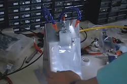 | (35)缶ジュースキャッチャー「無駄な谷人2009」 左右軸ストローク600mm、前後軸ストローク350mm、上下軸ストローク150mmを操作して缶ジュースを捕まえます。 使っているのは全軸高級シリンダです。「谷人たちの美術館」出展に合わせ、惜しげもなく在庫品を放出した極めて贅沢な遊具です。 操作部も最初はフィンガバルブを使っていましたが、男心のくすぐりが弱く、高級ハンドバルブに替えました。 動画はこちらをご覧下さい。老若男女、少年の心さえあれば大いに楽しめます。 |