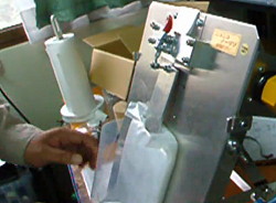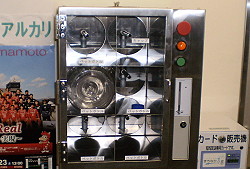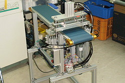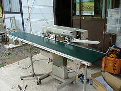 | (71)薄物梱包機「ギョウチュウケンサ」 何と言えばいいのだろう。「ピリピリ剥がせるシール」で薄物を梱包する機械です。 厚紙をコンベア右手にセットし、厚紙の上に薄物を置きます。それから始動スイッチを押すと指定時間コンベアが流れます。コンベア中央にはウレタン巻のローラープッシャがあって、指定の圧力でシールを貼り付けます。 ピリピリというシールの音が幼き頃のギョウチュウ検査を想わせます。故郷が恋しくなる梱包機です。 |