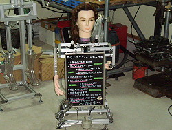 | (52)多目的広報用ロボット「MICHIKO」 前々から要望が多かった広報用の人型ロボットを試作しました。顔、右手、左手、胸が音楽に合わせて動きます。 これを叩き台に要望の具現化に努めたいと思います。 |