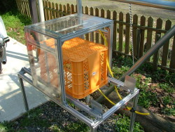 | (29)コンテナ洗浄補助具「逆さ走り」 果樹園などでは凄まじい数のコンテナを使います。それを洗うのは自動洗浄機か手洗いですが、前者は価格と維持費が凄まじく、後者はすこぶる地道です。 手洗いの困難な点は箱内側の洗浄らしく、現場を見に行ったら一人がコンテナを持って、一人が水をかけて、一人がブラシで擦ってました。 「少しの値段で何とかならんか?」 そう言われ、何とかなるように思えたので、こういう補助具をつくりました。コンテナが逆さの状態で横に走ります。下に洗浄ノズルを付け、出しっぱなしにしておけば一人でコンテナが洗えます。頑固な汚れは別途ブラシで擦ってやる必要がありますが、少なくとも人海戦術の効率は上がったと思います。 |