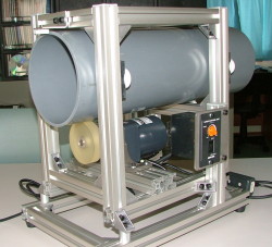 | (16)円筒回転実験機「コロリンパ」 円筒を回転(可変速)させる機械です。 高速回転で回る円筒の中は、実に不思議な力で溢れています。遠心力の教材に、白玉団子の大量生産に、暇つぶしに、用途は色々無限大、地元の子供たちはスーパーボールを入れて遊んでました。 もちろん角度調整も自由自在、パイプをアクリル(透明)にすれば更に楽しめます。 |