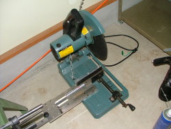 | (27)アルミ切断機「ビューティフォーカッター」 端材を整形するため、メタルソー切断機を作りました。最初、手動送りにしていましたが、過負荷でモーターが止まってしまったため、送りを定速(サーボ送り)にし、回転軸は強力ドリルに替えました。送り速度は厚みに応じ、「遅い/速い」を切り替えます。 ワークの固定はΦ40のシリンダ(2本)です。 ワークを可動式のストッパに突き当て、バルブのレバーを回し(固定)、スタートボタンを押すだけでビューティフルな切断ができます。 |