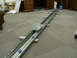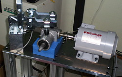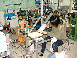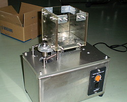 | (14)横型耐久試験機「乗り乗りスパイラル」 NEJI-RIN(F社製)の横型耐久試験機です。人が乗っても動きますので室内サーフィンが大いに楽しめます。 モーターは可変式。最速だとけっこう怖いです。 ちなみに使用しているガイドは中古品で、短いものを強引に繋げて使っています。 |