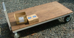 | (23)悪路用搬送台車「ミナちゃんロング」 前作「ミナちゃん」をご覧になったお客様がその場で発注していかれたロングバージョンです。ステージサイズは800X1500、かなり巨大です。タイヤサイズは280mmから200mmと小さくなっていて、流行の低床低重心です。天板はお客様の要望でコンパネ板にしました。1枚だと華奢だったので2枚重ねにしました。 リピート製作が可能です。テーブルサイズ、タイヤサイズが指定できます。詳細はこちらをご覧下さい。 |