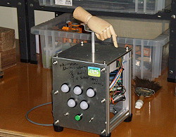 | (18)汎用型制御盤「夢追箱」 キーエンスのパネル付きシーケンサーを前面に装備し、その出力として100ボルトのコンセントを4箇所装備しています。入力もトグルスイッチが5箇所と非常停止が1箇所、その他予備もありますので、あんな事やこんな事、その他いろんな事がプログラムをいじるだけで簡単に実現できます。 イベントの演出に、寿命が短い設備の制御盤に、家庭内の自動化に、嗚呼、夢が広がる汎用型制御盤です。 |