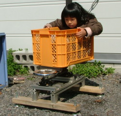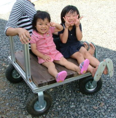 | (22)悪路用搬送台車「ミナちゃん」 未舗装の道において通常の台車が使えず困っていました。そこで空気入りタイヤを取り付け、こういった台車を作ってみました。搬送能力は300キロ、ガタガタ道や柔らかい道も難なく行きます。 倉庫から事務所、弊社の部品搬送に大活躍の予定でしたが、そう出番もなく、もっぱら子供の遊び道具になりました。特に三女がお気に入りなので「ミナちゃん」と名付けました。 人力車としても大活躍。道を問いませんのでお年寄りや子供を乗せ、田舎の道を疾駆できます。 |