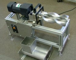 (7)Uスパイラル型アイス充填機「アンリ1号」 Uスパイラル搬送という斬新な方式で粘っこいアイスを送り出します。 (特徴) ホッパに入れたアイスクリームを二本のスパイラルが蛇口方向へ回転搬送します。搬送速度は自由に設定でき、制御はフットスイッチです。あんこや生クリームにも使え、蛇口の形状も選べます。モーターと蛇口部分がネジ4本で外せるので、消毒、清掃が容易です。 |