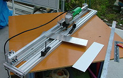 | (49)ニブラ式板金切断機(大)の試作 メーターバン(1000X2000)のアルミ板を切りたかったのでストローク1000mmの簡易切断機を作りました。前作はスライドガイドを使っていますが、本作はフラットバーをガイドにしています。バーを樹脂ベアリングで挟み込み、それなりに真っ直ぐ進む構造です。(耐久性に難あり?) |