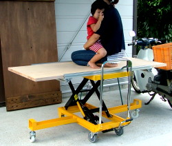 | (24)ワイドリフトテーブル「アゲアゲU」 テーブルサイズ520X820のリフトテーブルを700X1800に改造しました。足場を2本のチャンネルで延長し、天板には30ミリの木製天板を貼り付けています。上昇時、天板がグラつきますので、木材を挟み込み、ちょいと落としてやる事で安定します。 オーダーメイドの設計品を安く上げるためには大量生産完成品の改造がオススメです。 |