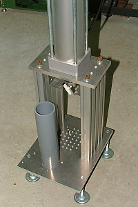 | (40)簡易式エアプッシャ「押すだけ君」 果汁を搾るため簡単なエアプッシャを作りました。 塩ビのパイプに半切りした果実を投げ入れ、蓋をし、足踏みバルブを踏みます。するとプッシャが下ります。エアプッシャの力は約250キロです。(0.5MPa時) 塩ビのパイプには細かな穴があり、横と下から果汁を流します。この設備を丸ごとタライの中に入れ、上の循環を繰り返すと、それなりに果汁がたまります。 【この設備のポイント】 ・塩ビパイプの位置決めは段付ピンで行います。パイプの径が変わっても対応できるよう規格に合わせピン穴をあけています。ピンを取れば汎用エアプッシャとして多目的に使えます。 ・油圧プッシャに比べると力が弱いので果汁の残量が多いです。しかし構造が華奢でコンパクト。当然軽く、値段も安いです。 |