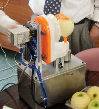 | (26)電動果実皮むき機「しまちゃんU」 弊社においては画期的、合計3台も売れた「しまちゃんS」が更にお安くなって掃除しやすくなって登場です。縦刺しから横刺しになり、ちょっぴり作業性が悪くなりましたが、そのぶん果汁のタレに強くなっています。これにて梨の皮むきがエンドレスで可能になりました。 掃除の際は電気部品に水をかけぬよう注意する必要はありますが、樹脂部(機能部)は水濡れOKになりました。これにて水をかけた後、歯ブラシで磨くという作業が可能です。 詳細はこちらをご覧下さい。 |