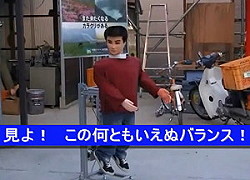 | (44)電動回転遊具「藤本君」 地元のテレビ局が「産業廃棄物で作った遊具が見たい、撮りたい」と言ってきたので、電動回転遊具を作りました。老若男女、適度な速さで回る事ができ、大いに楽しめました。 ちなみに「藤本君」という名前は撮影に協力してくれた藤本君から採っています。かなり気に入ってくれました。気に入ってくれたついでにプレゼントしようと思ったのですが貰ってはくれませんでした。邪魔になるそうです。仕方がないので撮影後すぐに壊しました。 |