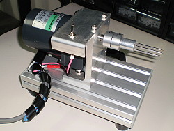 (12)回転切断ユニット「徳永さん」 切断ユニットの試作第一号で、展示会用実演機を兼ねています。薄く薄く研磨された回転刃が普通紙を厚み方向に切り裂く様は、ビックリを通り越して失禁してしまいそうです。(ショーは極めて地味) 展示会が終わった後、この機械は試し切り専用機として末永く愛用される予定です。 |