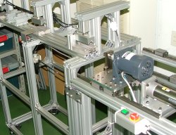| (34)シール機のガイド(導入部)改造 横型シール機の改造をやりました。既存のベルトコンベアを外し、長手の可変速コンベアを置き、緩やかな角度でガイドを設けました。その結果、シール機へ投入する手間が減り、大幅コストダウンに繋がりました。 |