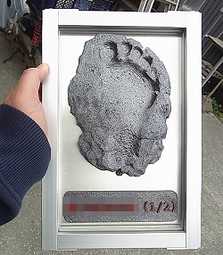 (444)未確認生命体の観賞用足跡 馴染みのお客さんがワクワクしたいそうです。色々考えた結果、ネッシーとか雪男とか未確認生命体の事を考えるとワクワクするそうで「まずは足跡が欲しい」と言われました。 そういう仕事大好きです。 すぐさま僕が知ってる一番ゴリラっぽい人に粘土を踏んでもらい、それを一週間乾かした後3Dスキャナーでスキャン、手持ちのプリンタで出力しました。ホントは足のサイズ38cmで出力したかったのですが持ってる3Dプリンターが20cmMAXにつき1/2出力、それを塗装後、アルミで額を作って貼り付けました。 約10日これの事ばかり考えてました。作った後、何やってんだろ俺って思いました。 |