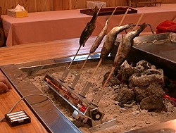 (458)田楽自動回転器「田吉」 田楽を知ってる方なら分かりますが囲炉裏に刺さった串をクルクル回すのは意外と大変です。熱いから軍手しなきゃならんし、呑むと面倒になるし、油断すると黒こげになります。 「これ自動で回るの作れん?」 以前から色んな人に言われてましたが、やっと試作費を出してくれる人に出会い鋭意実験しました。動画はこちらをご覧下さい。 |