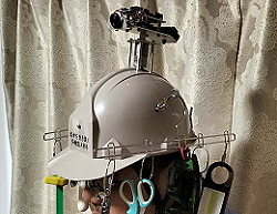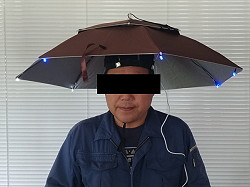 (498)帽子風の明るい日傘 テレビ局の依頼で作りました。かぶる日傘の先っぽにカラフルLEDを付けました。夜でもよく目立ちます。傘の中にはUSBポートを2つ装備していて読書灯とか扇風機も付けられます。盲点だったのは夜に日傘は使わないという事。不評でした。 |
