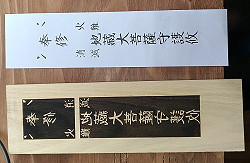 (453)祭神一覧奉納額 用意された立派な木材に指定の文言をレーザーで焼くという仕事です。ウチのちゃんからレーザーの焼ける範囲が190X300mmなので7回段取り替えをして半日がかりで焼きました。色んなところにザッと使ってもらってます。こちらをご覧頂き「うん使えそうだ」と思ったら是非使って下さい。 |