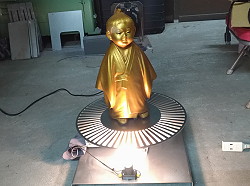 (472)回転無我童子 歓迎くんに使う部品を集めるべく古物商巡りをしてたら横山大観の「無我」その鋳物人形と出会いました。ジーッと見てたら回したくなり2000円で購入。回転テーブルを作り、下から光を当てて回しました。満足です。駅に設置します。 動画はこちらをご覧下さい。 |