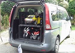 (433)セレナ用乗用遊具搭載棚 中国製の乗用遊具が訳あり1台2000円で売ってました。安い。即購入。確かに線が切れたりカバーが割れたりしてたけど修理すれば十分乗れます。娘(4)は大喜び。近所の人も欲しいと言うから更に数台買いました。こうなると保管場所の問題が出ます。 「そうだ!車(セレナ)の中だ!」 8台搭載できるよう寸法測って棚を作りました。車止め完備で移動中も動きません。 |