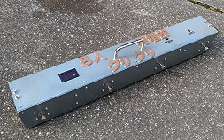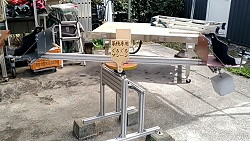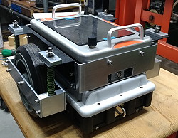 (502)牽引用サス付き車輪 レーダーを引きずって地中の色々を見るという作業があるのですが、人間が引くのは重くてもいいけどGPS搭載の牽引車で引くには軽くしないと引けませんでした。そういう訳でサスのバネ圧(調整可)でレーダーの荷重を受ける車輪を作りました。だいぶ軽くなりました。 |