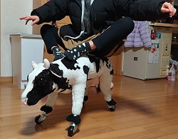 (504)四つ足用ローラーシューズ 牛の人形にタイヤを付けて欲しいという四女の依頼で作りました。足を切開してみると鉄筋の切りっ放し。鉄筋径に合わせてキャスター付きパイプを作って突っ込みました。 作った後、居間でノリノリ遊ばせたらタイヤの跡が残って大変。嫁がキレて即お蔵入りになりました。 |