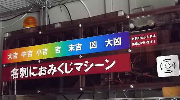 ステップ2:名刺におみくじスタンプを押そう!(所要時間:1分) 係員の指示に従って任意のタイミングでボタンを押して下さい。1/7の純粋抽選で大凶から大吉までを決定し、名刺にスタンプします。(動画はこちらをご覧下さい) お一人様一回を厳守下さい。何度もやりに来る子供は鬼嫁に叱られます。 |