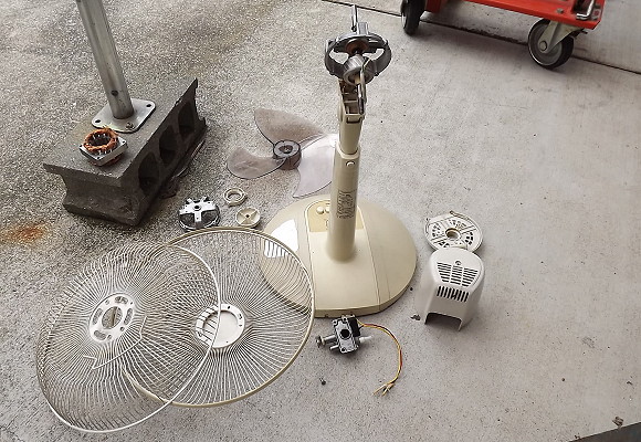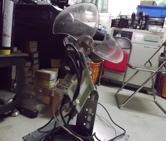 | 2014年8月6日。扇風機が壊れた。 バラしてみるとモーターが焼けていた。軸受がきつかった。軸受がやられた後、モーターが焼けてしまったらしい。 長年連れ添ったモノなので修理をしたいと思ったが軸受の交換とモーターの巻き替え費用を想像するに買った方が圧倒的に安かった。 娘(9)を呼んだ。自由研究に困っていたので壊れた扇風機をあげた。 「これを組み立てたら凄くいい勉強になる」 手回し発電機(手作り)も与え、発電機は回すと電気が起こる、扇風機は電気を貰って羽根が回る、 「このアベコベが自由研究に最高」 何度も何度も説明した。娘も熱心に話を聞いた。 (さあ、どんな自由研究になるだろう?) 父親として凄く気分が良かった。軽い足取りで場を離れた。娘もすぐいなくなった。何か調べものでもしているのかと部屋を覗いてみた。漫画を読んでいた。 「自由研究やめたんか?」 「ああ、あれ・・・、もう飽きた・・・」 娘は20秒で飽きた。扇風機の残骸は放置された。 私は仕事を続けた。その日は機械の組み立てをしていた。 作業場の室温は34度。エアコンはなかった。窓を全開にしていたが無風で湿度も高く、作業着がビショビショになった。 「無理ー!」 私は保管棚に走った。手頃なモーターがあるだろうと思った。扇風機は壊れても羽根は壊れていなかった。モーターに羽根を付けたら扇風機であった。 あいにく保管棚にはギアモーターしかなかった。ギアモーターじゃスピードが足りなかった。速いモーターはないか。中古のサーボモーターを発見した。 サーボモーターというのは位置決め用のモーターで、モーターのお尻にエンコーダというのを積んでいる。このエンコーダというのが速度や位置の情報を出し、サーボパックというのがその情報を元に出力を制御する。簡単に言うと凄いモーターで、モーター界の頂に立つ高級品であった。 サーボモーターを回るだけの扇風機に使うのはハッキリ言ってもったいない。が、もったいないゆえリッチな風が吹くだろう。世の中にセレブな人は多かれど、サーボモーター扇風機を使っている人はいない。 「それはなぜか?」 「ムダだから!」 サーボパックは優秀な頭脳。その頭脳はエンコーダの情報を解析し、最適な出力をモーターに与える。ループ制御とかフィードバック制御とかPID制御とか、私もよく分かってないが、クルクル回る高等な仕組で回転を制御する。 「何を制御する?」 「扇風機!」 「えっ!扇風機?」 爽快だった。日本が世界に誇るスーパーコンピューター「京」でソリティアをやるようなもので、実に気分が良かった。 仕事を放り投げ、扇風機作りを始めた。 端材を集めた。穴だらけの板金にキャスターを付けた。土台なのに板厚が薄かった。モーターもペランペランのアルミ板に引っ付けた。引っ付く部材は高級なのに引っ付けられる構造材が徹底的に貧弱で凄く笑えた。 「いるよね、こういう人?」 扇風機の名前を「インテリ野郎」に決めた。バカのひがみをネーミングに織り込んだ。 回してみた。回った。が、回るだけではいけなかった。サーボモーターの性能をフルに発揮する必要があった。 サーボモーターはパラメータを調整する事でその性能をギリギリまで高める事ができた。その作業をチューニングといい、適度な値を探してやる必要があった。 ゲインというマニアックな数字をチョロチョロいじった。この数値はサーボパック(頭脳)が求める目標値とモーターが出す現在地との差を修正する熱量で、ゲインが高いほど神経質で熱血漢。上げ過ぎると大いに震えた。 「修正だ!」 「やべっ!行き過ぎ!」 「逆に修正!」 「また行き過ぎー!」 こういう感じになった。逆に低すぎると差を受け流すのでダラッとなった。 扇風機は機械だけれど、これは人間みたいで楽しかった。今回のインテリ野郎扇風機は神経質なインテリという設定なのでプルプル震えるぐらいまでゲインを上げた。 モーターは指令に対し寸分の狂いもなく回った。500と言ったら500、501や499は許さなかった。その細かさは時代の申し子。融通の利かないマジメちゃんであった。 作っている最中、お客さんと嫁が来た。 「何作ってるの?」 「サーボモーター扇風機!どう?」 誇らしげに見せた。が、サーボモーターを知らぬ嫁は苦笑した。 「いまどき扇風機なんて千円ちょっとで買えるでしょ!その部品幾らすんの?」 さすがに十万円とは言えなかった。笑って誤魔化し、奥へ隠した。 嫁がいなくなって徐々に回転数を上げた。300、600、900、1200、300ピッチで徐々に上げ、1500あたりで音が変になった。感覚として、今までの扇風機「強」が1000回転ぐらいだろう。1500は風量も凄いが音も凄かった。風切音が高かった。聞き様によってはブルースリーの怪鳥音に聴こえた。 「ショォァアー!」 ビデオに撮りつつ実験を勧めた。 (次の1800はどういう風が吹くだろう?) モーターを少し回し、ビデオのアングルを決め、それから本番を撮った。300から1500までその流れで撮