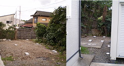 | 2011年9月5日 実父に助太刀をお願いし庭木の伐採と草刈を行う。 これにて設置場所ができたので、プレハブ屋が基礎となるブロックを設置。 左は昭和的空間の設置場所。右はトイレの設置場所。 危険なほどに進行中。 |