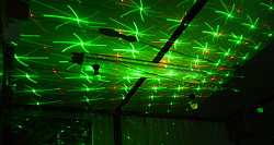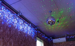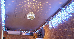 | 2011年10月6日 電飾、及びレーザーライトの取り付け完了。ミラーボールを併用する事で泣けるほど昭和。 スモークマシンやバブルマシンも欲しい。が、それは予算の都合で来年設置の予定。 現在進行中の作業はソフト作成。これが最も大変。曲数999曲。曲名と歌手名を入力するだけで丸二日を要す。曲と演出の連動も細かいプログラムが必要でゴールは見えず。 |