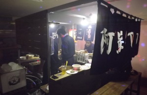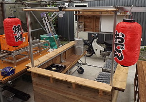 | 2014年5月23日 長手方向の暖簾が来た。椅子も消防団の希望する高さで三つ作った。厨房の物置台も作った。ド演歌だけを集めた屋台用音源の編集も完了。 ひとまずコレで完成。 そろそろ仕事しないと干上がってしまうので、今後はボチボチ進めるの巻。 (長暖簾寄贈:下田有志の会) |