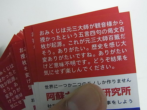 近所の寺から借りた元三大師百籤和解を三日も読み込みアソカラなりに現代語訳。更に延べ一週間以上かけ、慣れないイラストレーターで名刺型にデザインしました。 2019年内に仕上げるつもりが55番で挫折、年を跨いでやっと100番に到達。泣きたくなるほど疲弊して作ったおみくじです。 本来はおみくじマシン専用おみくじですが「マニアックゆえ欲しい」という方が意外に多く、試しに販売致します。 1番から100番、100枚セットの商品です。購入セット数によって単価変動致します。 1セット100枚:2400円(1枚24円) 2セット200枚:4400円(1枚22円) 4セッ400枚ト:8000円(1枚20円) 8セット800枚:14400円(1枚18円) 16セット1600枚:19200円(1枚12円) 32セット3200枚:35200円(1枚11円) 64セット6400枚:64000円(1枚10円) 100セット10000枚:90000円(1枚9円) 400セット40000枚:320000円(1枚8円) 表示は税込価格です。送料は別途頂きます。 8セットまではヤフーショッピングで買えます。 8セットまでは1〜100の連番一組でお渡ししますが16セット以上は各番号セット数でのお渡しとなります。お手数ですがお客様の方で混ぜ混ぜお願い致します。 400セット以上購入頂けますなら裏面「阿蘇カラクリ研究所」の所を御社のロゴや文言に変える事も可能です。ご相談下さい。 トップページに戻る |
